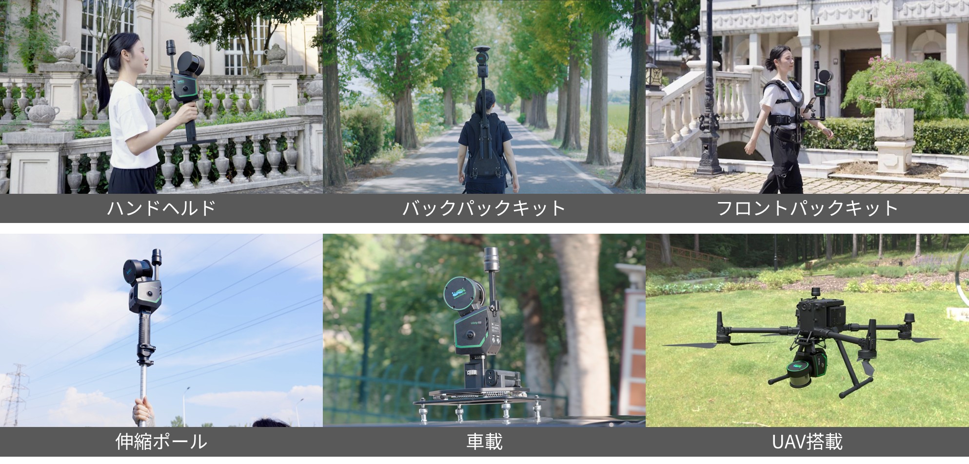 ハンドヘルド形式に加えて、バックパック、フロントパック、伸縮ポール、車載、UAV搭載などの様々な専用モジュールをご用意しています。
