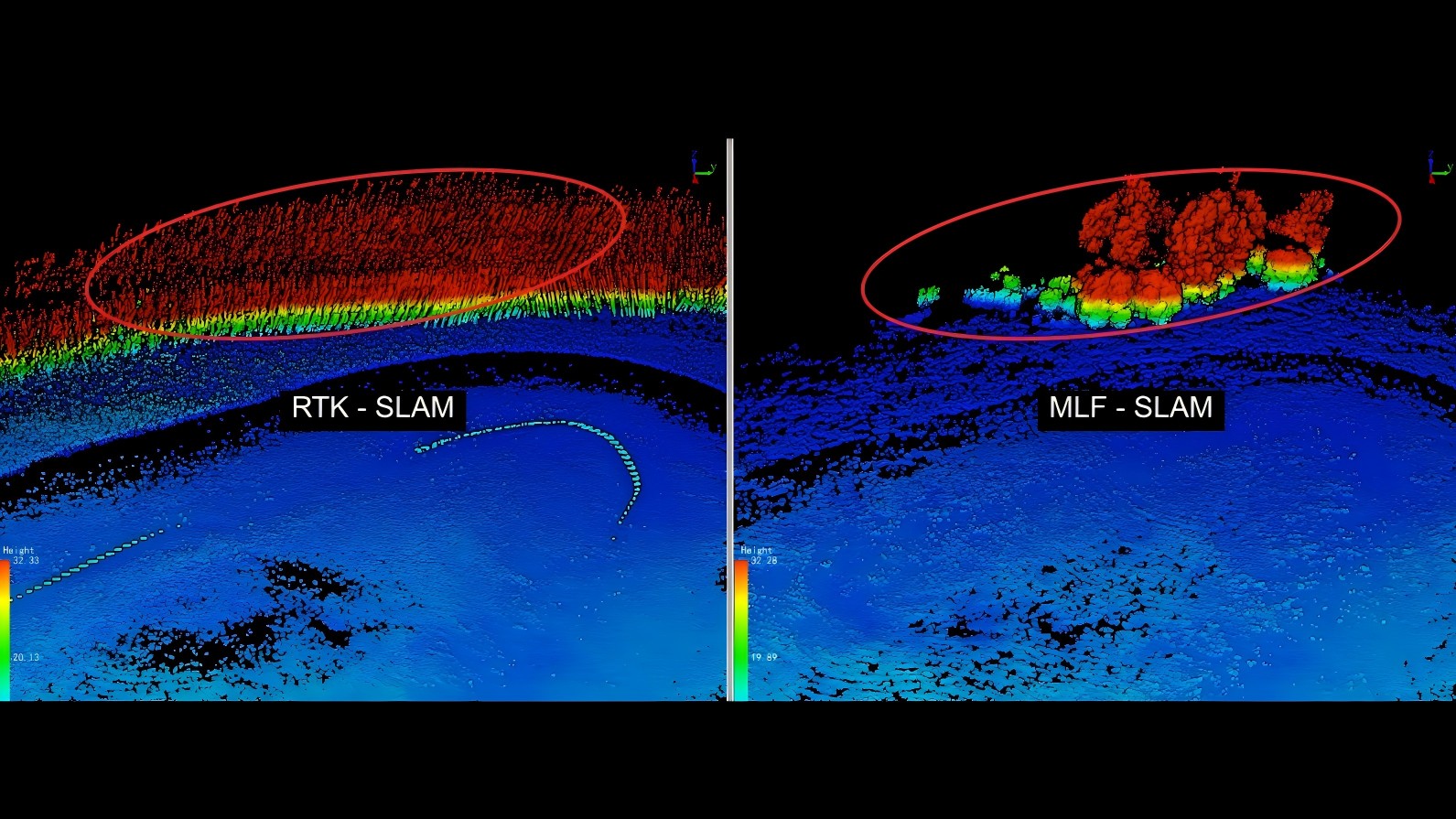 RTK-SLAM と MLF-SLAM GNSS が弱い、または利用できない高速道路、海岸、橋梁などにおいて、MLF-SLAM は安定した軌道、一貫した点群、信頼性の高いマッピング結果を保証します。 |