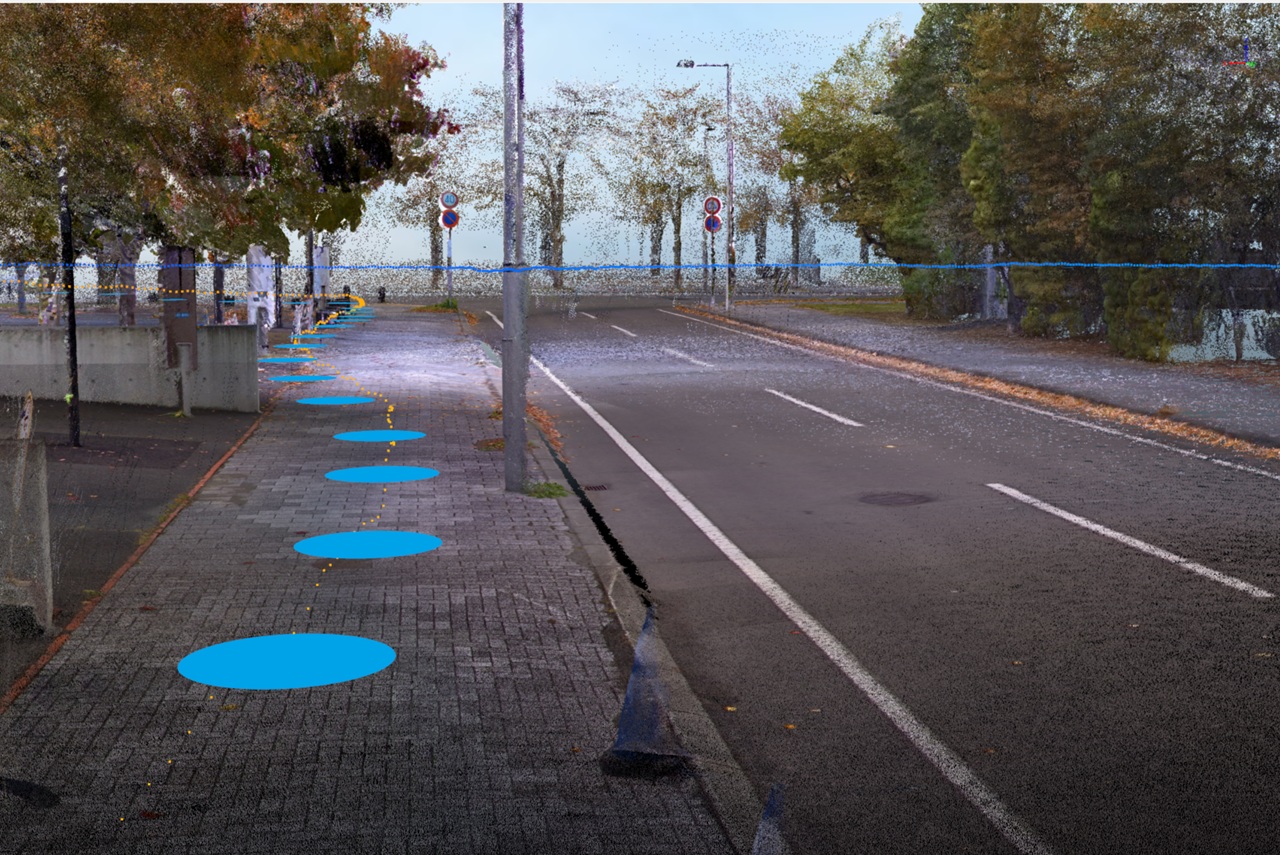 廉価モデルのO2 Liteは秒速1m/s程度でゆっくりと歩く必要がありますが、O2のLiDARセンサーはかなり強力の為、普通の速度3~4m/sで歩く事が可能です。かなりリアルに点群を取得出来ています。(下図の点群は、周囲や中心部の不要な建物は編集にて削除しています。)