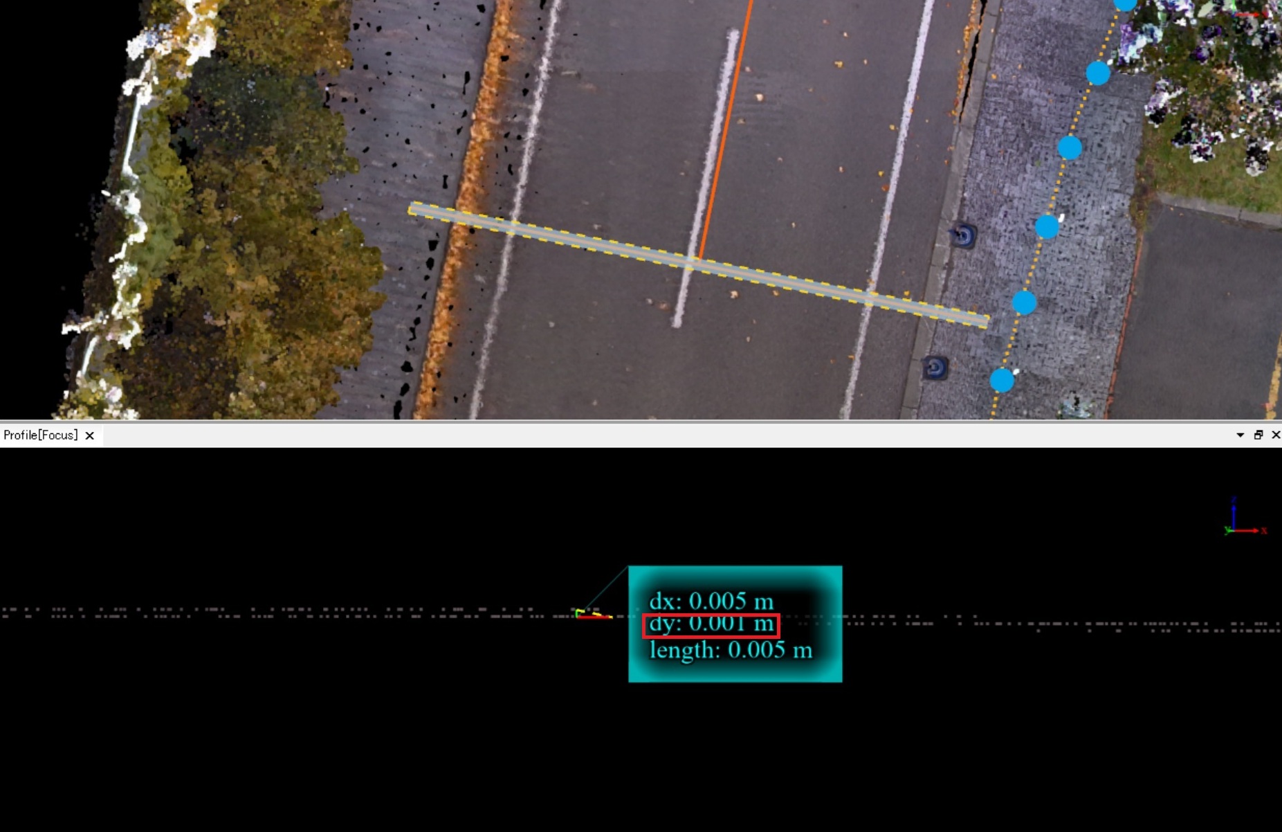 SLAM LiDarは、ドローン搭載のLiDARとは違い、自己位置を高いレベルで推定する為、地面の厚みが少ないのが特徴です。10か所程度確認しましたが、地面の変な重なりは見られず、1mm~8mm程度でした。